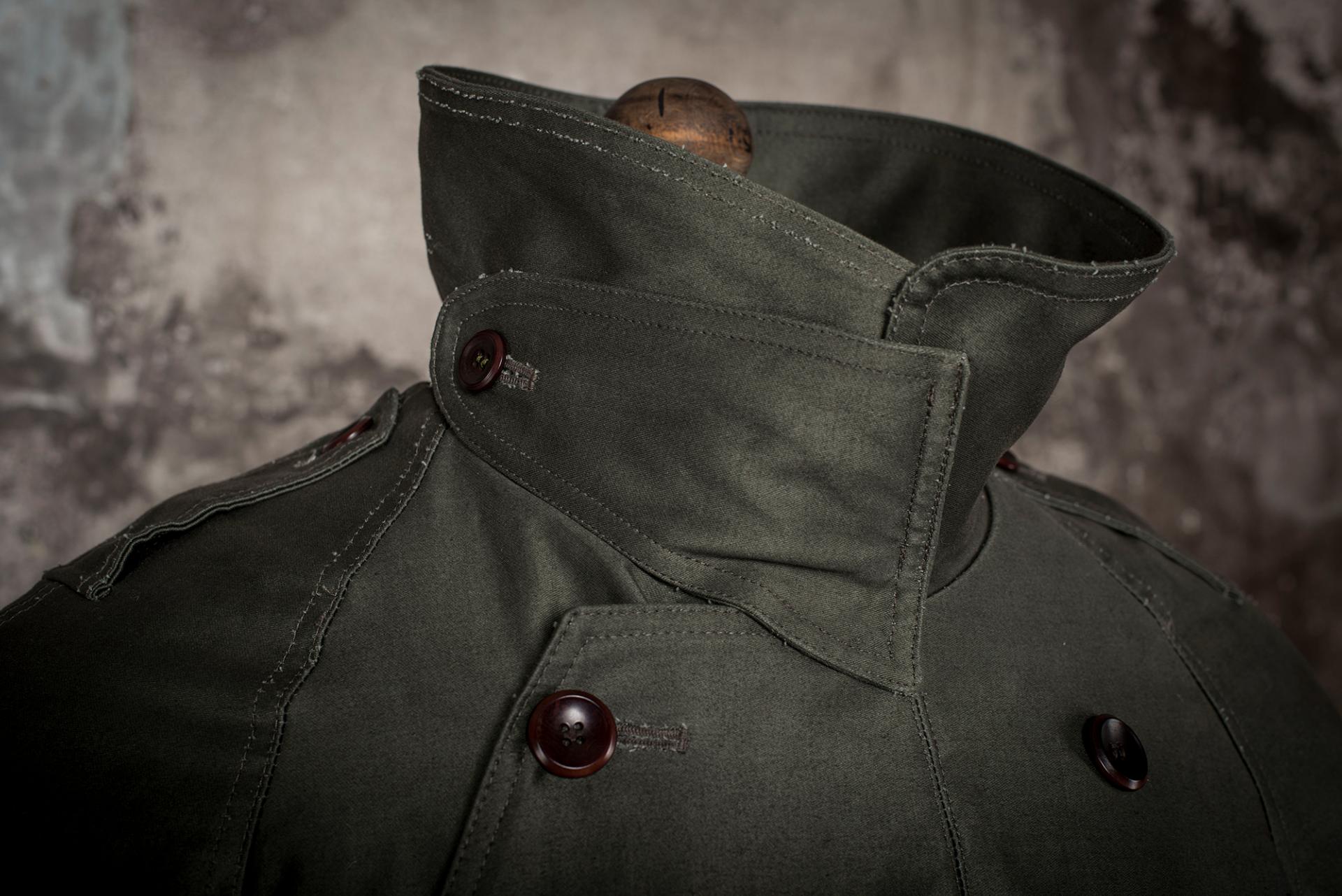 Ce paletot, en grosse toile de coton Moleskine Kaki est inspiré d’ un modèle 1938, spécialement conçu pour les motocyclistes de l'Armée Française.